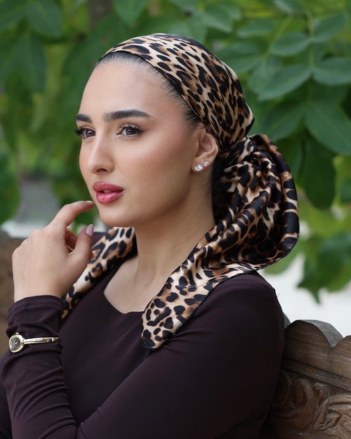 המטפחת מביאה לידי ביטוי את ההדפס המנומר הקלאסי , בשילוב גווני החום והזהב יוצר מראה עשיר שמאיר את הפנים ומתאים לכל גוון עור. דגם שמשדר נוכחות דומיננטית עם רכות נשית.